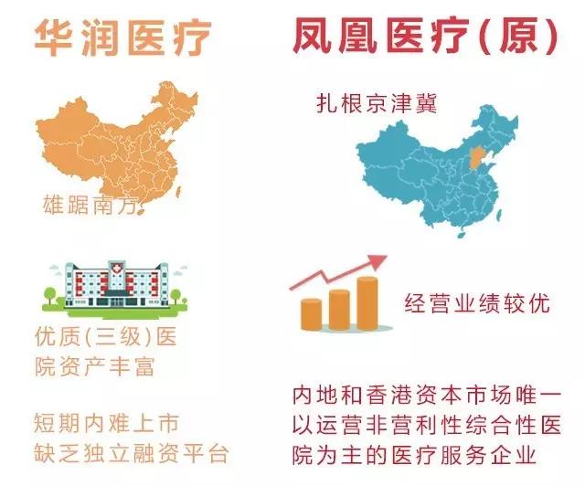 華潤自2015年1月開始接觸鳳凰醫(yī)療團(tuán)隊并初步溝通合作意向,經(jīng)過多次磋商籌劃交易方案,最終確定以資產(chǎn)換股權(quán)方式實現(xiàn)華潤醫(yī)療主要資產(chǎn)上市,并成為中國最大醫(yī)療服務(wù)集團(tuán)的單一最大股東。同期,“華潤鳳凰”與中信醫(yī)療簽署協(xié)議,以發(fā)股方式收購中信旗下2家營利性醫(yī)院。